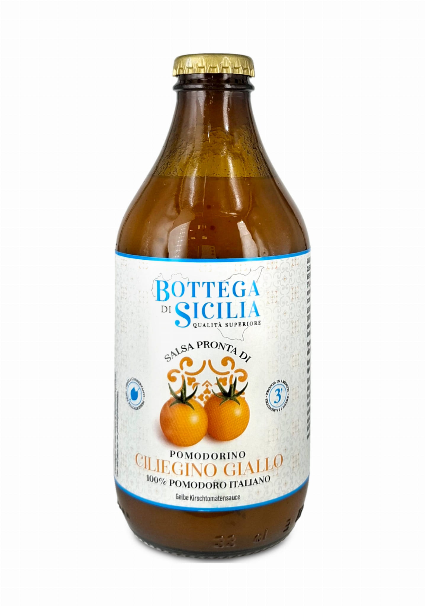 Bottega di Sicilia – Salsa pronta di pomodorino ciliegino giallo to gotowy sos pomidorowy klasy premium, przygotowany z wyjątkowych żółtych pomidorków koktajlowych (ciliegino giallo) dojrzewających w sycylijskim słońcu.