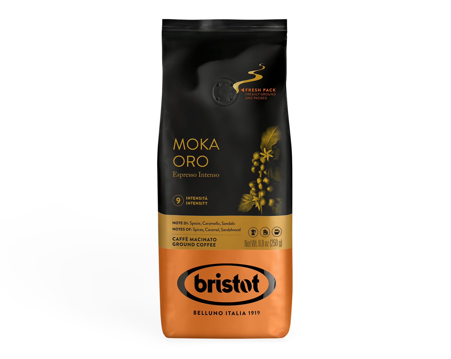 Ziarna pochodzą z wyselekcjonowanych plantacji w Ameryce Południowej i Azji. Każda partia jest palona we włoskiej miejscowości Belluno zgodnie z tradycją marki Bristot, działającej nieprzerwanie od 1919 roku.